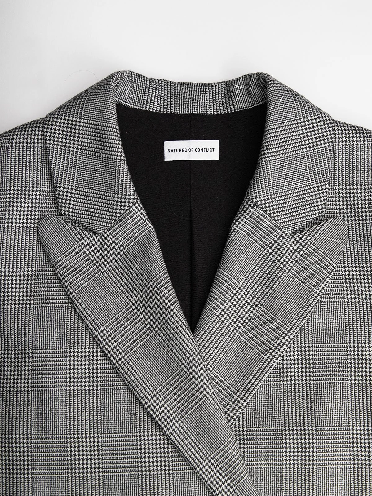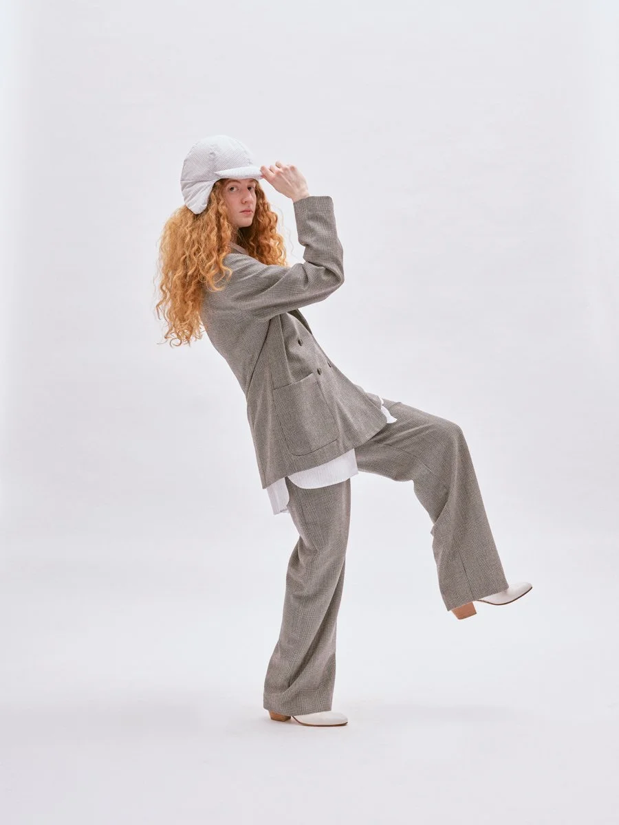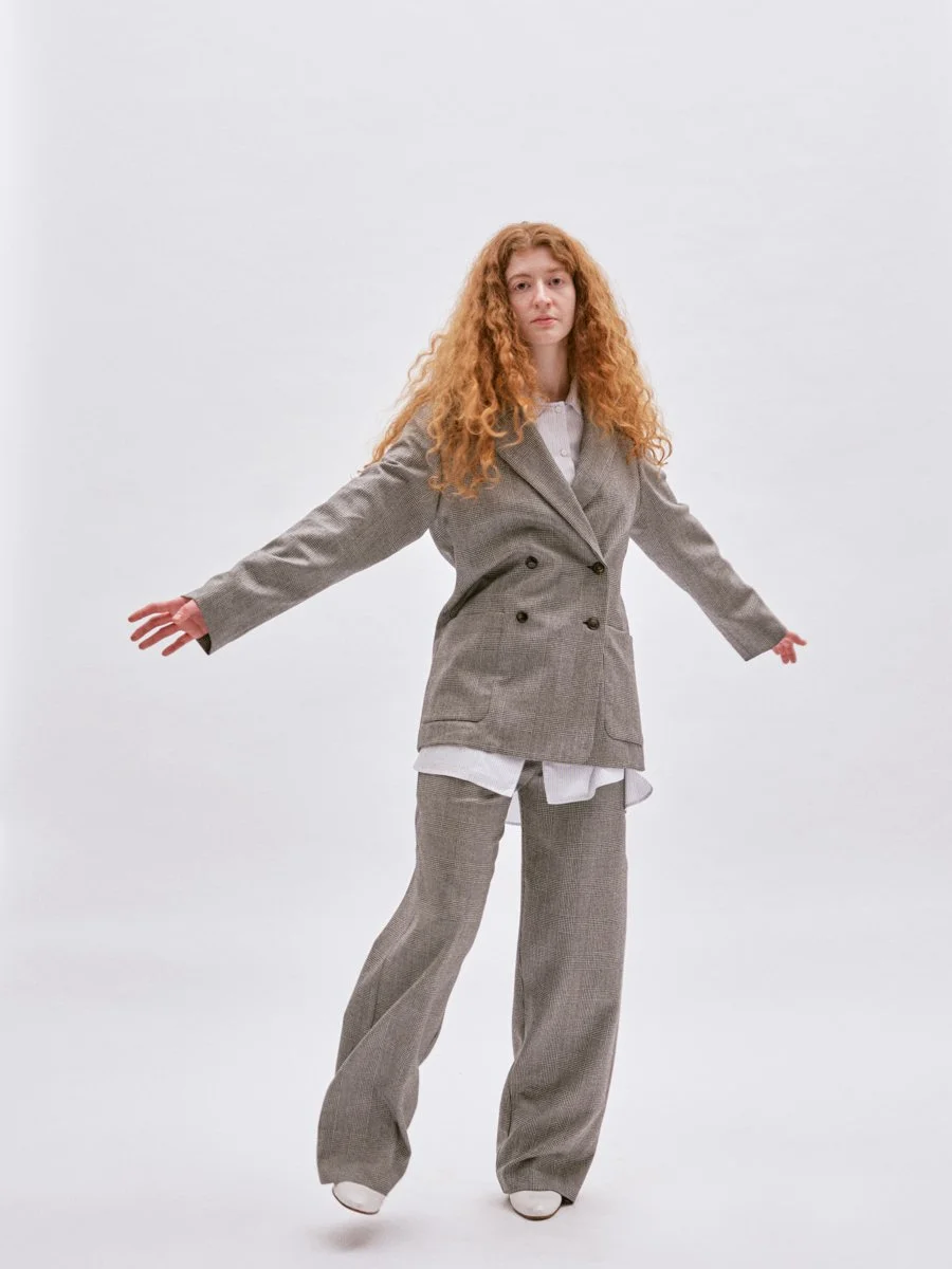 The 4 button double-breasted Soft Sakko has a slightly shaped long cut. No shoulder pads nor any stiff inlay is added so it falls smoothly over your body. The wide lapel has rounded corners. The back features the recognizable NoC hanger detail and a slit. The Sakko has 2 patch pockets and no visible seems.
